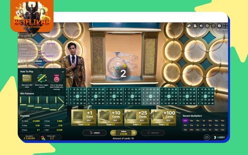 เกมคาสิโนสดที่ได้รับความนิยมมาเป็นอันดับที่ 2 เกม Mega Ball หรือเกมบิงโกนั่นเอง โดยเกมนี้เราสามารถเลือกการ์ดที่ต้องการเดิมพันได้ โดยจะมีราคาที่แตกต่างกันออกไป เลือกได้ตั้งแต่ 1 การ์ด ไปจนถึง 10 การ์ดเลยทีเดียว ยิ่งเรามีการ์ดมากเท่าไหร่ ก็จะมีโอกาสรับเงินรางวัลได้สูเท่านั้น โดยเกมนี้เราสามารถมองเห็นการหมุนบอลได้อย่างชัดเจน เพื่อเพิ่มความยุติธรรมได้มากที่สุด ให้ความปลอดภัยได้มากกว่าเดิม